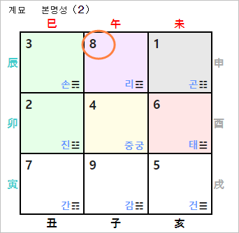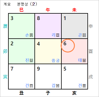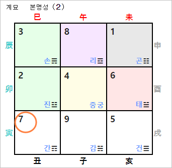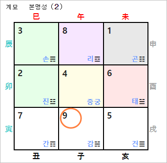 2023년 계묘년의 경우 상수 9는 태궁이 위치한 서쪽 방위입니다. 그러나, 계묘년의 계수와 연반의 지지 유금이 묘유충으로 파살을 이루게 되어 취기방향으로 적합하지 않습니다. 파살 방위를 범하게 되면 추진하는 일이나 사업에 부침이 따르기 쉽고, 대인관계에서도 불화와 갈등이 따르게 됩니다.